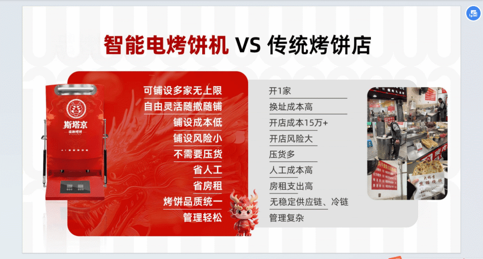 斯塔京智能电烤饼机的登场,精准戳中传统模式的痛点。在铺设灵活性上,它甩开传统店铺几条街。传统烤饼店受限于固定门店,而智能电烤饼机可铺设多家无上限,自由灵活随撤随铺。想在商业街、学校旁、写字楼底搞点位?轻松安排!创业者不用被单一店铺绑定,能根据人流、市场反馈灵活调整,真正把生意主动权握在手里。