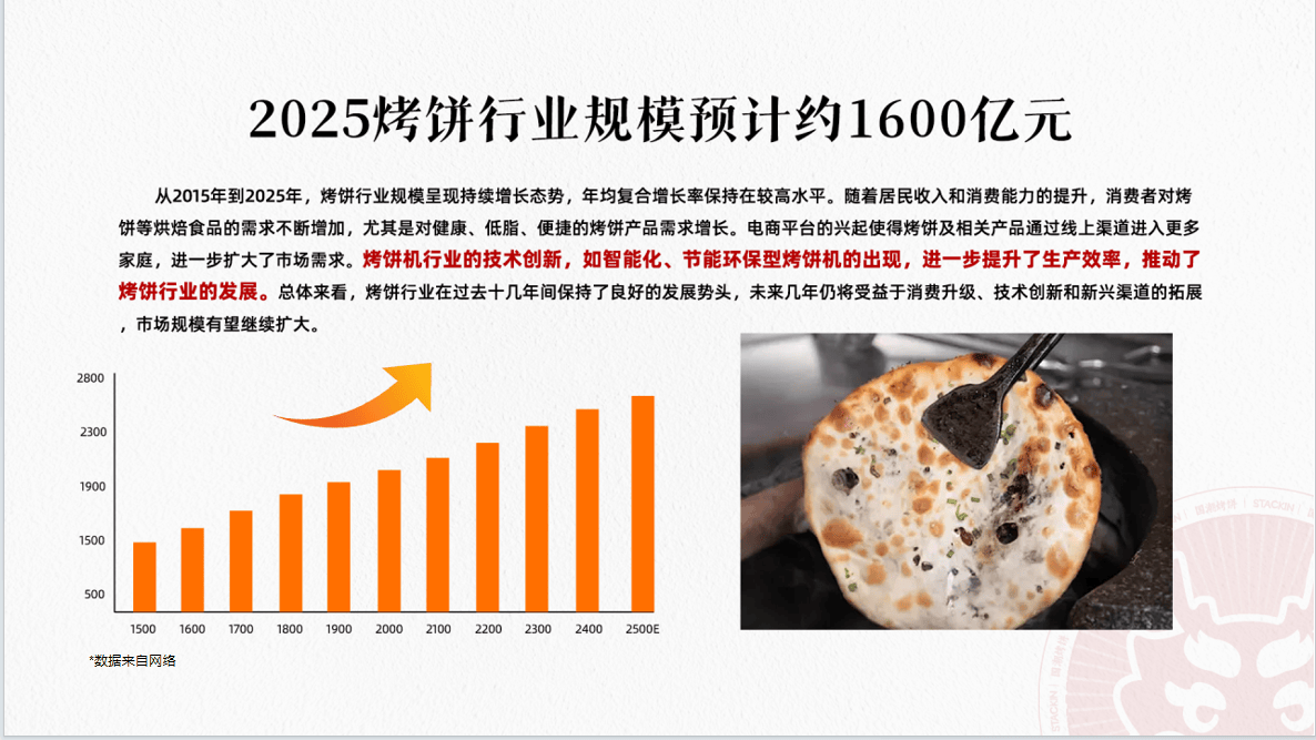 在美食的广袤天地中,烤饼以其独特的风味与便捷性,长久以来牢牢占据着消费者的味蕾。从 2021 年至 2025 年,烤饼行业规模呈现出迅猛的增长态势,预计在 2025 年将突破 1600 亿元大关。这片巨大的市场蛋糕,吸引着无数创业者投身其中。而斯塔京烤饼,宛如一颗冉冉升起的新星,凭借其创新的模式与卓越的品质,成为这一赛道上备受瞩目的焦点。