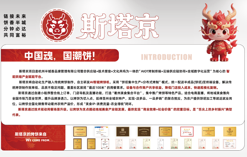 斯塔京项目是杭州半城香品牌管理有限公司整合供应链+技术壁垒+文化共鸣为一体的"AIOT烤制终端+云端供应链协同+全域数字化运营”为核心的智能烘焙产业赋能平台。