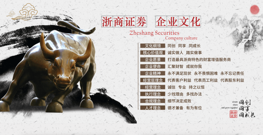 浙商证券将延续务实、守信、崇学、向善的浙商精神。以“同创 同享 同成长”为文化纲领,立志将浙商证券打造为最具浙商特色的财富增值服务商。